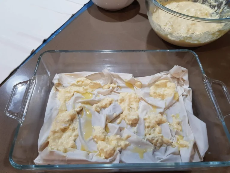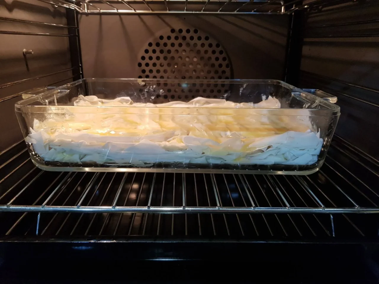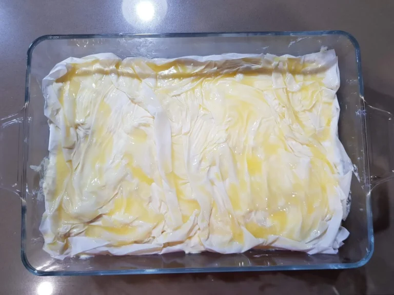 7. Continue layering 3 sheets of file with the mixture. The last layer can be just one sheet. Cover that with the melted butter.