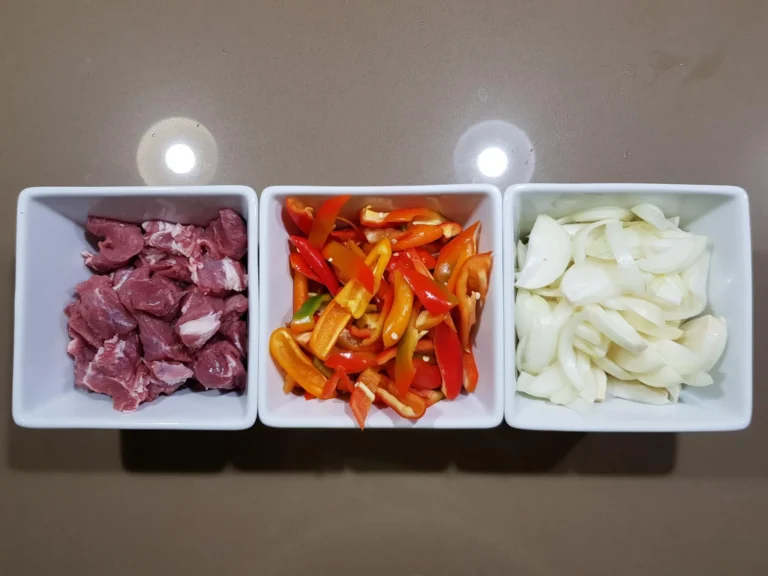 2. Prepare the ingredients. Chop the onions roughly. Slice the peppers in large strips. Cut the pork into bite-sized pieces.