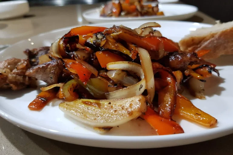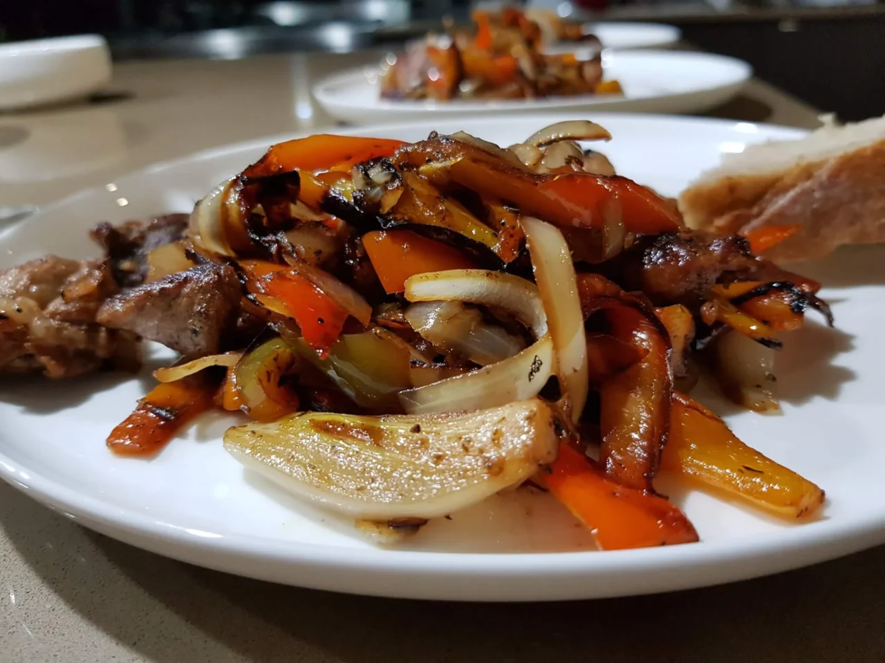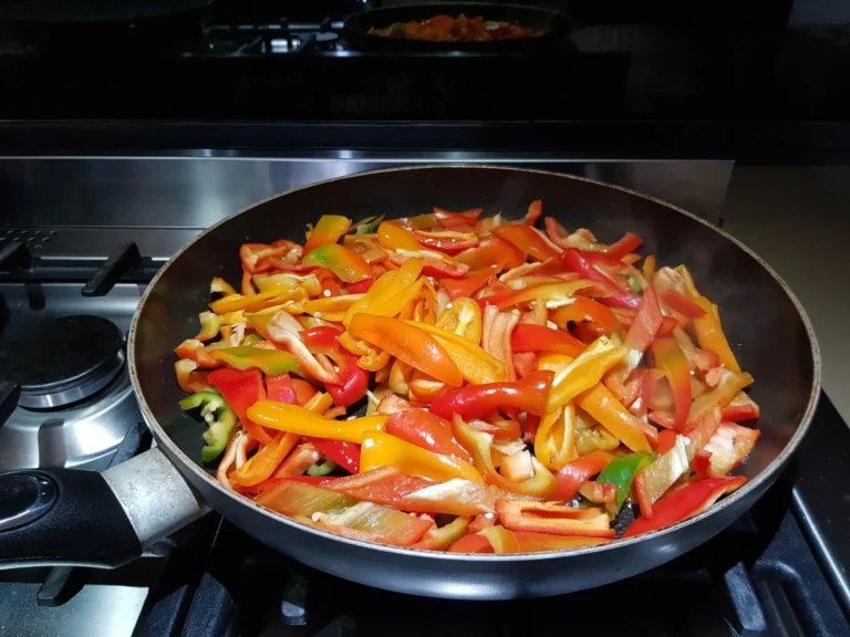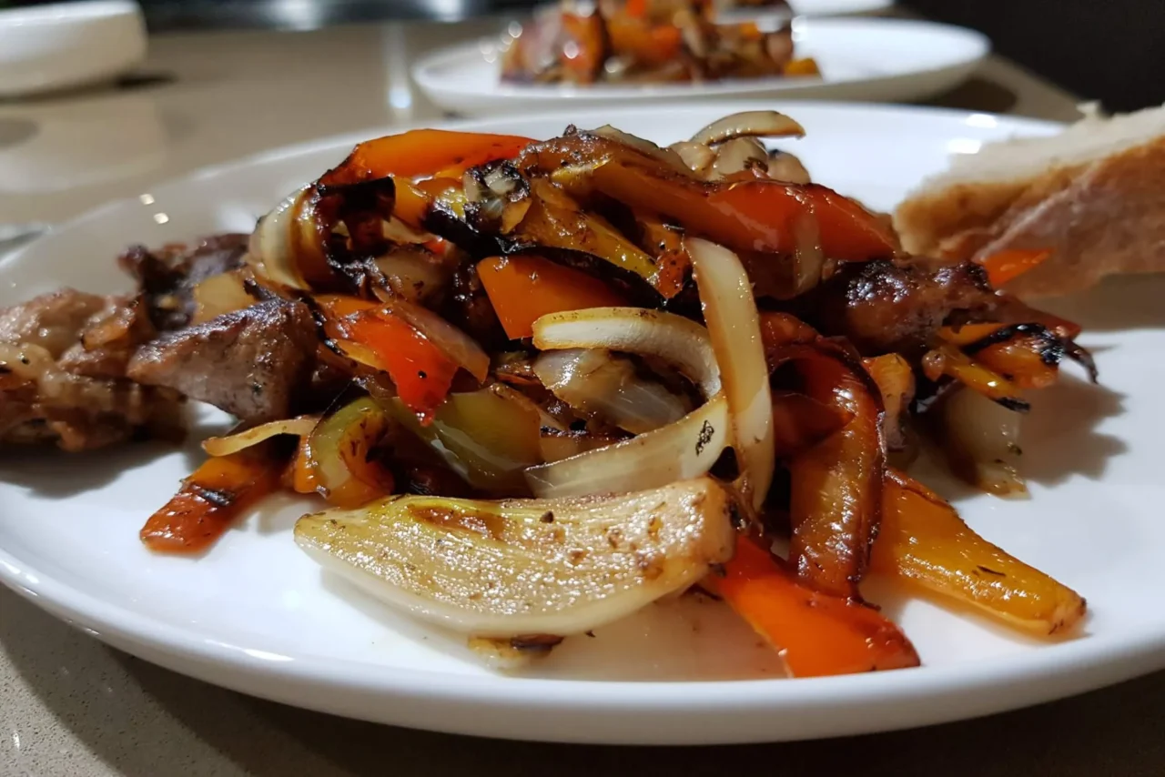3. Heat the oil in a pan and add the peppers and onions. You have to cook the vegetables separately from the meat for this dish. Fry them on high heat – they need to become kind of char-grilled, that is when they taste best.