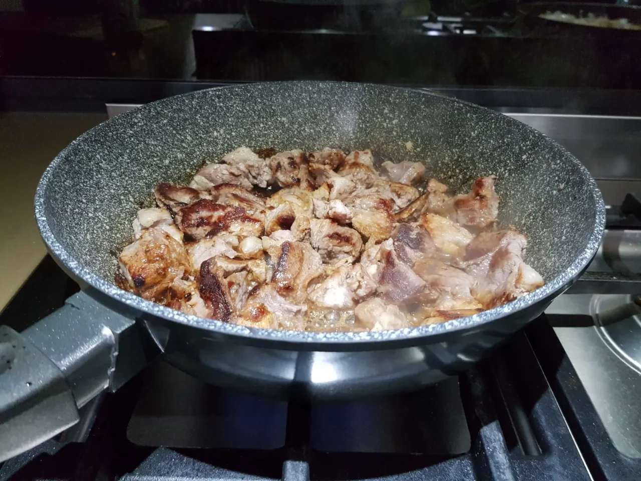 5. Add some more oil and cook the pork – fry it without stirring on side one to get a good crust, then turn and do the same on the other side.