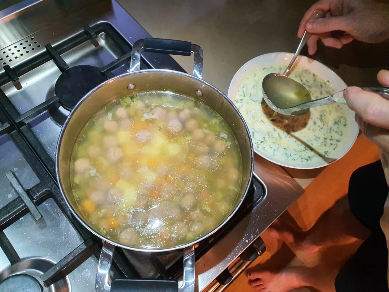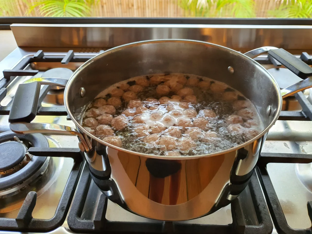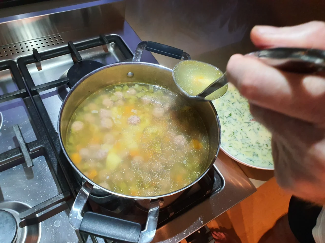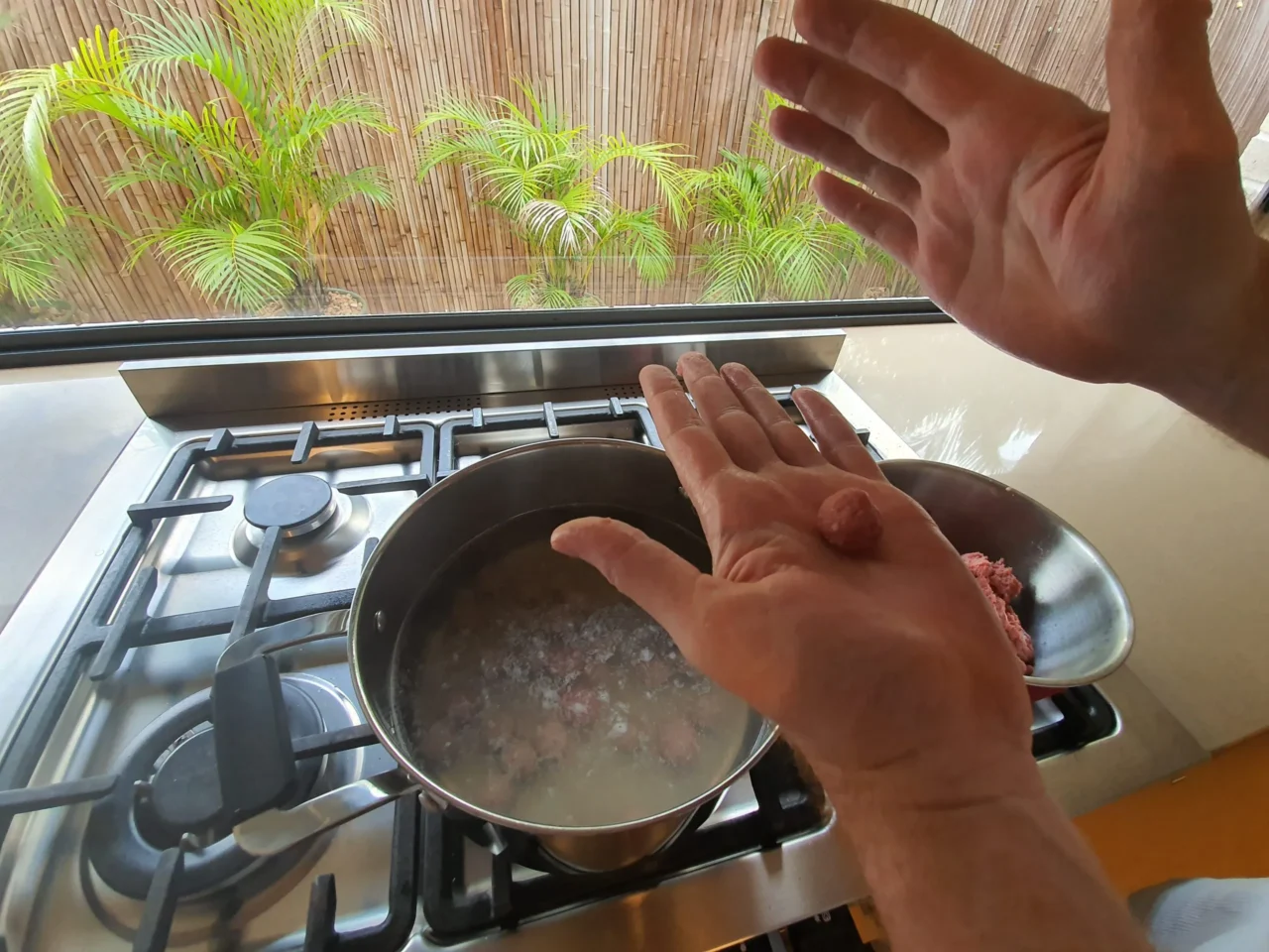 2. Put the mince in a mixing bowl, add ground black pepper and salt and mix. Make little meatballs and drop them into the pot. It doesn’t mater that the water is not quite boiling.