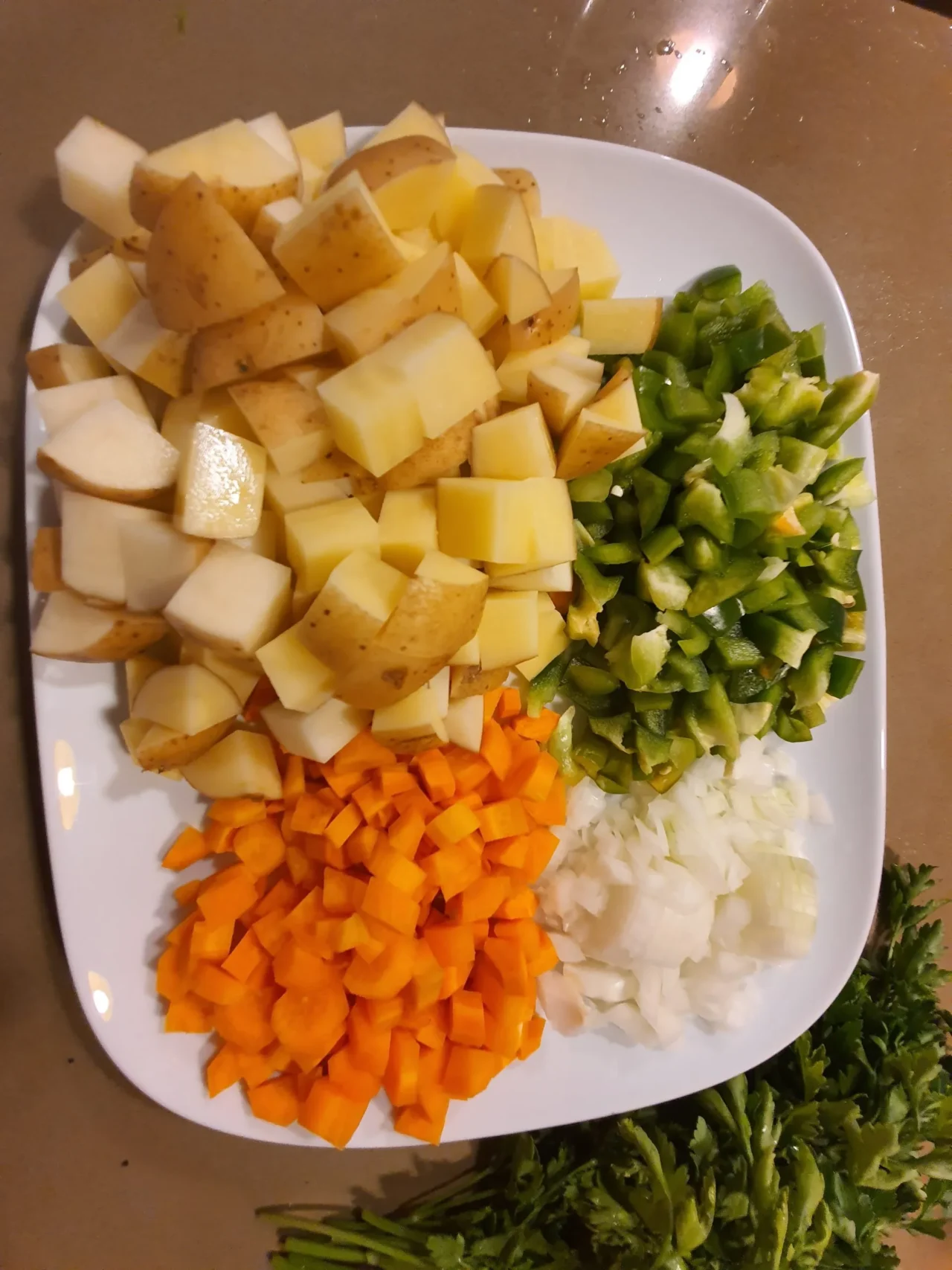 3. Chop the onions, dice the carrots and capsicum into small cubes, and the potatoes into larger ones.