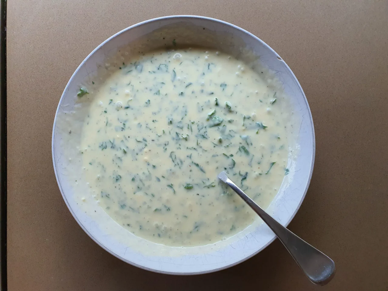 5. In a bowl mix the eggs, yoghurt, salt, black pepper and parsley into a homogeneous mixture.