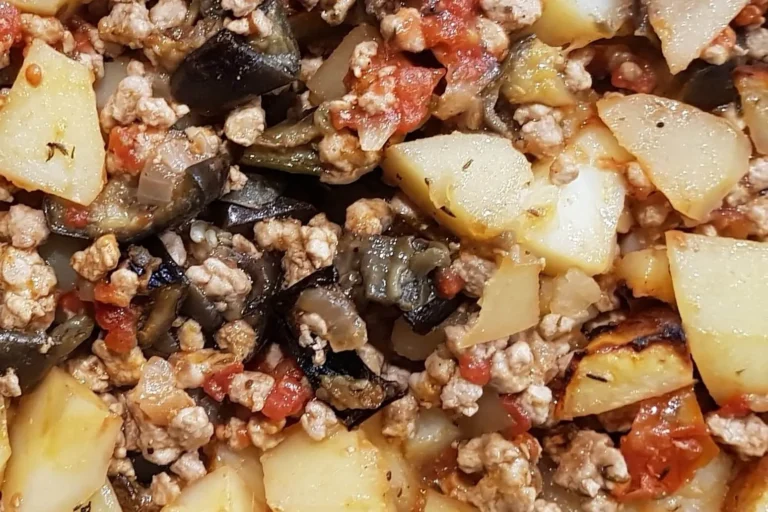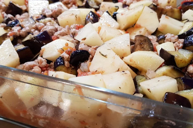 5. In the baking dish, place the cubed potatoes, cooked onion and mince mixture, the sautéed eggplant and the tin of chopped tomatoes. Sprinkle with salt pepper and oregano to taste and stir.