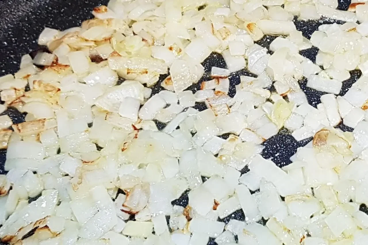 2. Heat up about 3 tablespoons of oil in a pan and sauté the chopped onion until golden brown.