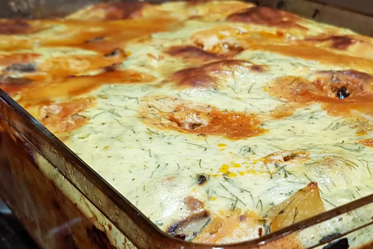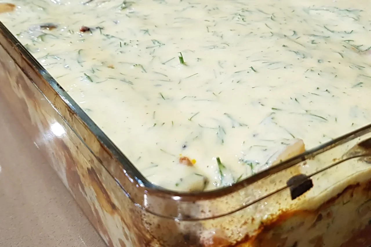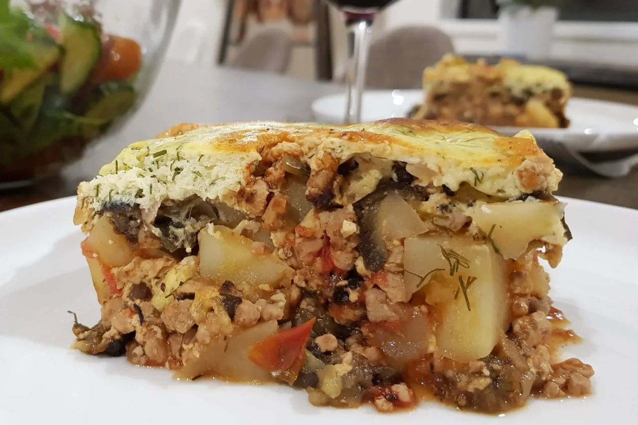 6. Bake in the oven at 190C for 1 hour. While baking prepare the topping. This is optional however it gives the dish a fresh and contrasting layer that goes well with the moussaka.
