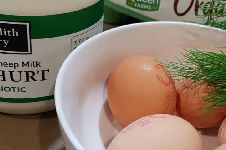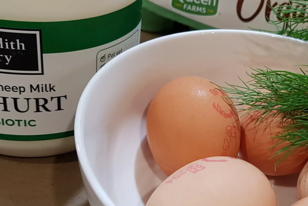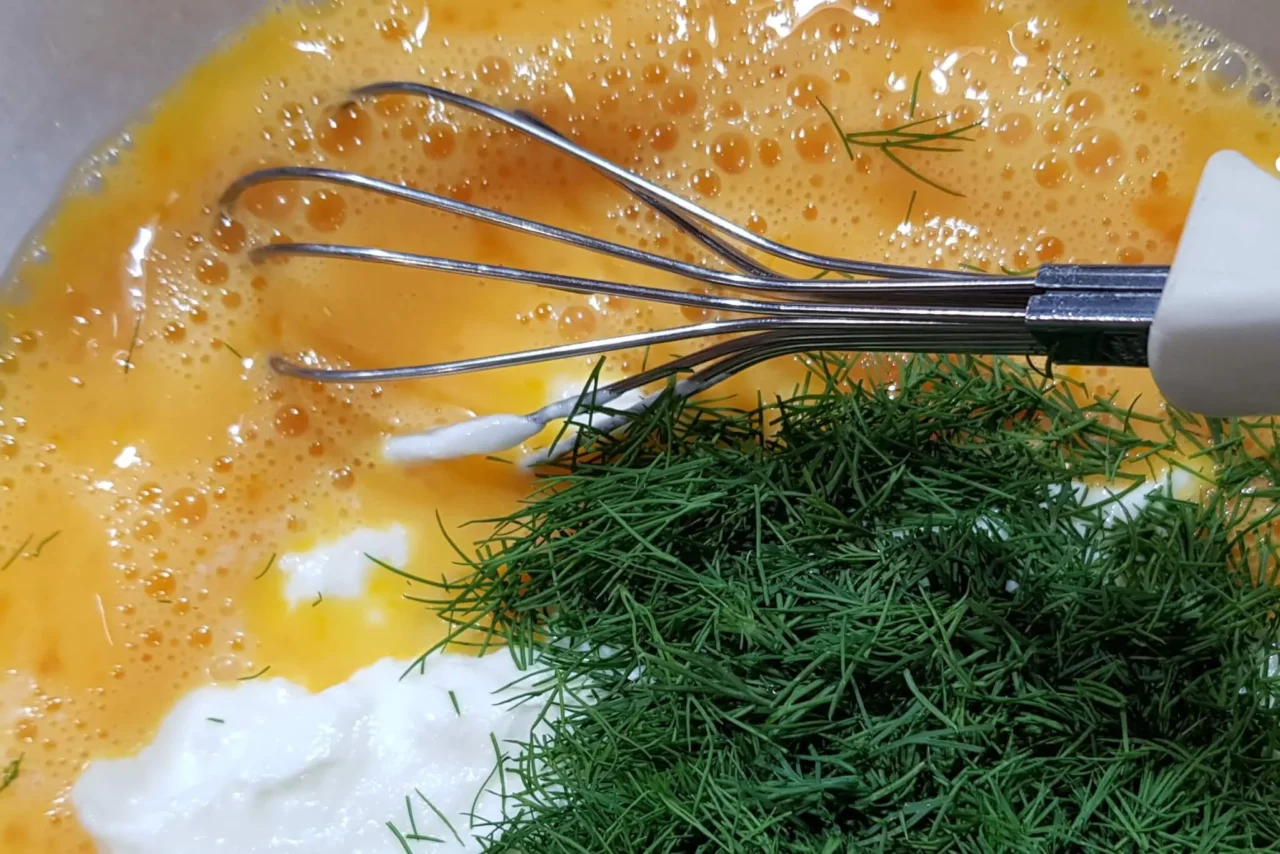 7. Beat the eggs lightly, pour in the yoghurt and mix in the chopped dill or parsley and mix them all together.