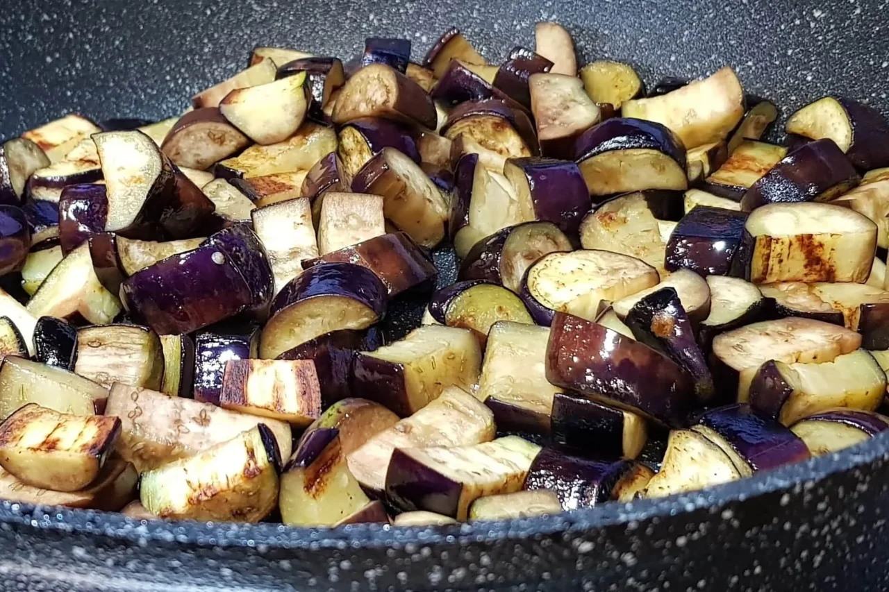 4. Add another 3 tablespoons of oil to the frying pan and sauté the eggplant until soft and golden.
