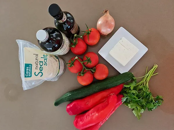 - Slice the tomatoes, cucumbers, onion and peeled peppers and place in a salad bowl.